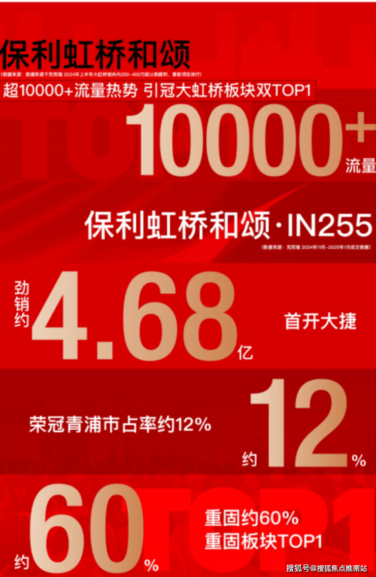青浦板块【保利虹桥和颂】以开篇者之姿,一举打破板块沉寂,凭借10000+人次现象级到访流量实力出位。继首作破局,战略纵深再落关键一子,【保利虹桥和颂.IN255】首开即强势斩获4.68亿元业绩,更以单盘青浦约12%、重固板块约60%市占率,给出了城市立新的标准答案。(数据来源:克而瑞2024年11月﹣2025年1月成交数据)
