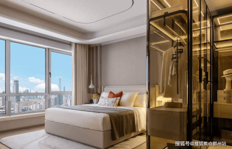 超约70㎡的南向主卧套房 ,是对品质生活的深层解读。将景观视野最大化地引入室内,并集成了功能完备的豪华卫浴与储物系统, 主卧连通蝶形的阳台设计 ,实现了“套房即小家”的便利与尊享。