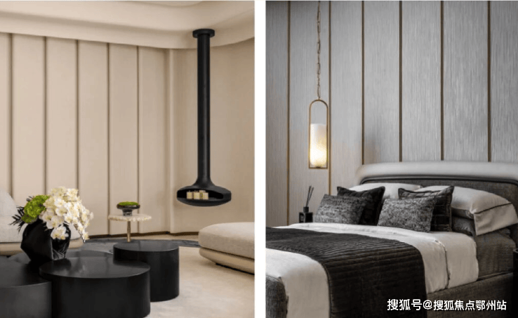 南向主卧套房约30㎡,设有步入式衣帽间及独立卫浴。 主卧特色背景墙由两种墙布搭配布置,上方背景墙通过波浪造型使得空间更加丰富。