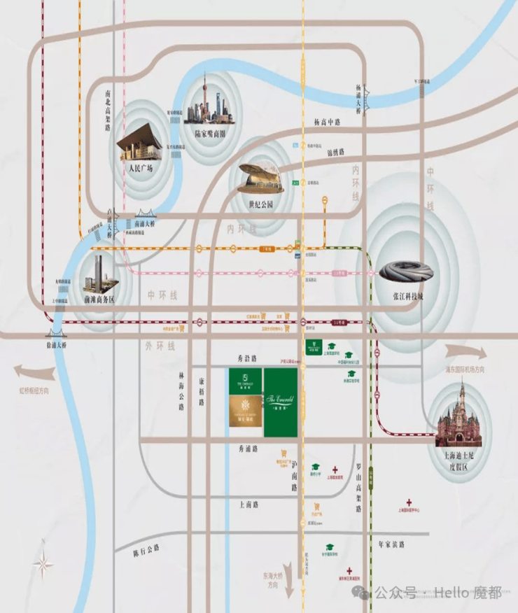 小区位于康桥板块,东接迪士尼国际旅游度假区,北接联洋世纪公园,距离陆家嘴约12公里。并且凭借区域内的中环线、S20 、地铁18 、11号线等道路交通设施。把康桥和前滩、张江科学城、迪土尼、浦东国际空港、外高桥自由贸易区等五大引擎连成一条黄金轴线。总结来说,这里属于浦东的交通要塞,拥有十分重要的战略意义。