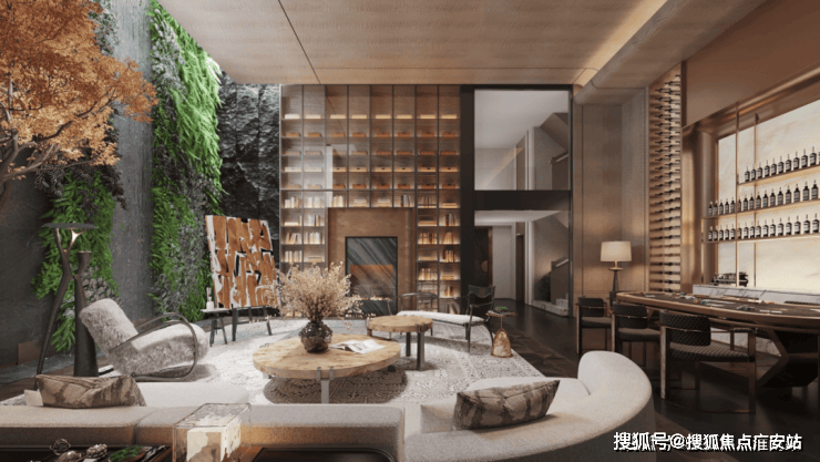 一进院:社区门口的6米宽瀑布景墙+落石+大乔组合,构筑起一道天然噪音屏障,进入瞬时隔离城市喧嚣!二进院:经过廊道,现代东方照明系统与景墙的组合,在光影变幻间呈现“移步换景”的归家仪式感!三进院:来到社区中央,18米宽的中心景观轴,搭配景观水池与疏密乔木,形成极简却又不失典雅气质的主景观花园!四进院:绿荫环绕的林下空间,为邻里交流提供惬意轻松的绿意场所!五进院:密植小乔合围的私密通道,配合定制石材院门,完成从公共到私域的过渡!1000平下沉式会所,安排了诸如健身房,私宴厅,四点半学堂,洽谈区等诸多功能,方便业主在这里安排社交活动。