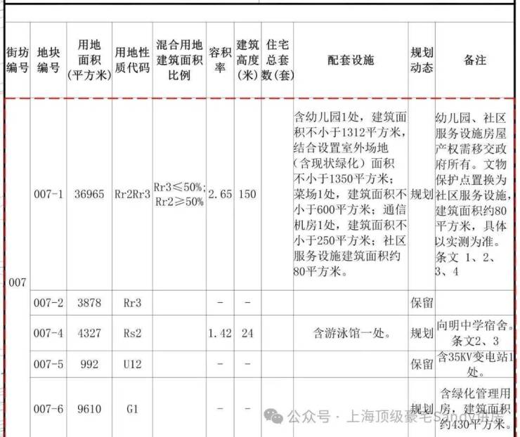 根据设计方案显示,007-01地块(大)拟建47栋3F多层住宅(包含部分底层商业)、1处幼儿园以及若干社区配套;将打造石库门风貌别墅产品。 007-01地块(小)拟建1栋43F超高层住宅以及若干社区配套,超高层无中小套户型要求,全装修比例为100%。 规划范围内各类保护保留历史建筑的建筑面积不少于5.28万平方米,其中优秀历史建筑的建筑面积约0.11万平方米,文物保护点约2.49万平方米。