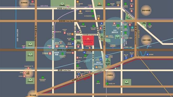 交通配套方面:项目地处长宁、徐汇、闵行三区交汇的金虹桥板块的核心区位,拥有多维立体的交通,延安高架、中环线、外环线环伺。