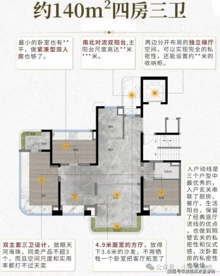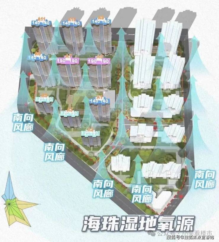 建面140平四房三卫,面宽16米,专梯入户,独立电梯厅,客厅面宽约5米,双主套三卫设计,U型厨房,140平主要分布在北侧后排高层,北边可望琶洲CBD景观,总价1000万起。