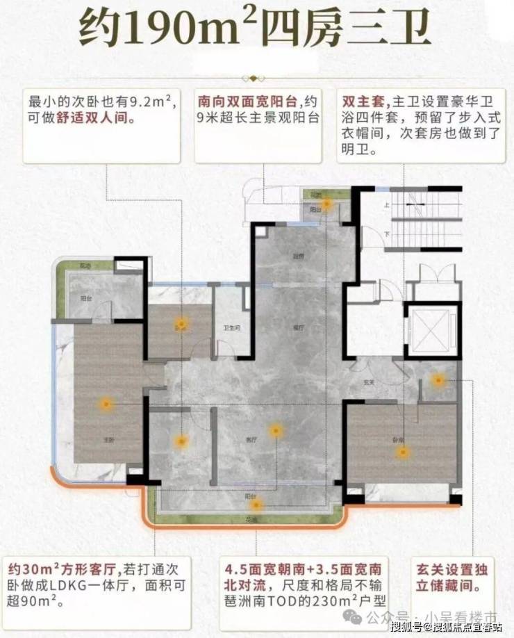 建面190平四房三卫,面宽18.2米,专梯入户,客厅开间5.7米,酒店式主卧套房,带豪华衣帽间,南北双景观阳台,约9米南向阳台,打通客厅旁的次卧可做成LDKG一体化,双卫设置了豪华卫浴四件套,总价1500万起。
