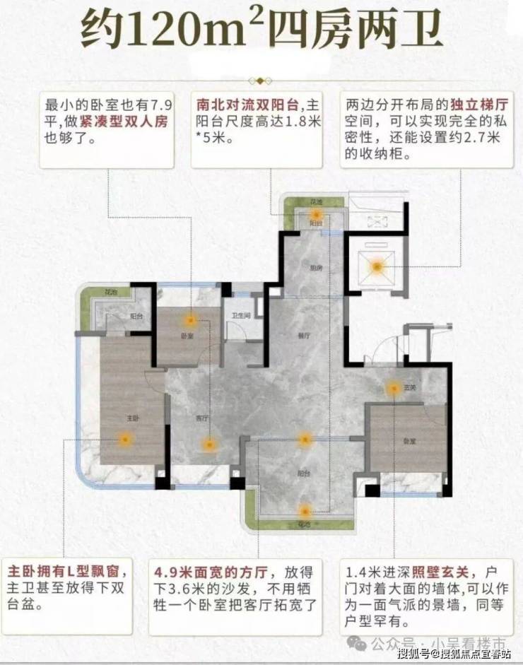 建面120平四房两卫,南北对流双阳台,面宽约15米,专梯专户,酒店式主卧套房带步入式衣帽间,带有L型飘窗,最小卧室7.9平,4.9米宽的客厅,目前这个户型以及卖完了,二期会有三栋120平的,但是现在限制新规,不知道户型会不会变。