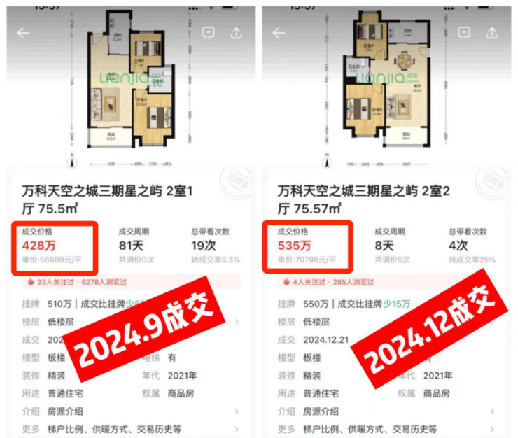 知名标杆二手,万科天空之城3个月猛涨107w,同样的户型面积,单价拉回了7万/㎡,且成交周期更短。