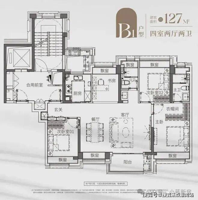 来看看更大一点的户型—— 建面约127㎡超阔四房 ,同样是 南向横厅设计 ,并拉伸至4开间,空间舒阔。主卧套房设计,也有足够的收纳,打造专属秀场。