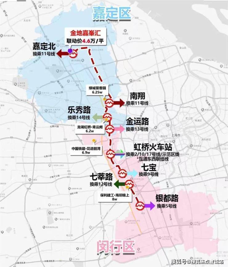 8站直达大虹桥,连接嘉定科技城、马东、南翔、大虹桥、七宝、莘庄等副中心,真正实现嘉定与大虹桥产业互联和人口互通。