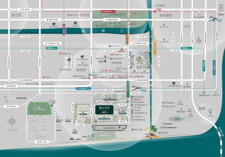 首先来看城市主干道,海湾地处上海南部,伸入海湾腹地的沪金高速、浦星公路、林海公路早已率先对接市区。