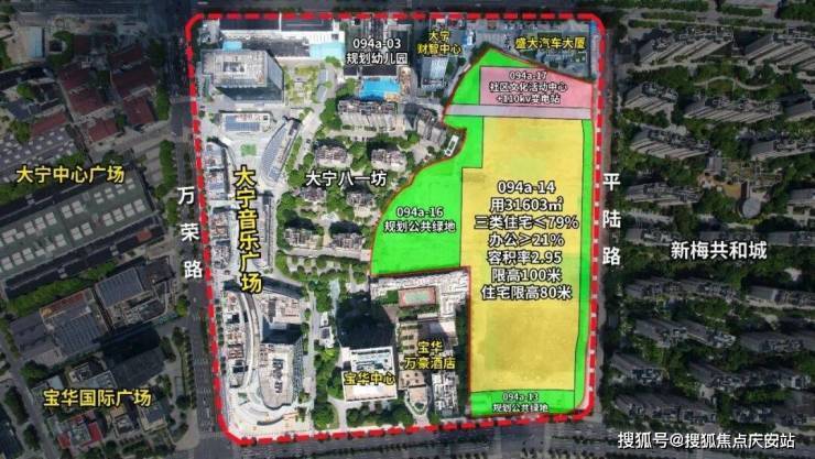 该项目位于大宁公园北侧、东临新梅共和城,占地面积约31603㎡,容积率2.95,限高100米(住宅高度不超高80米),计容面积约93229㎡,其中住宅占比≤79%,办公占比≥21%。