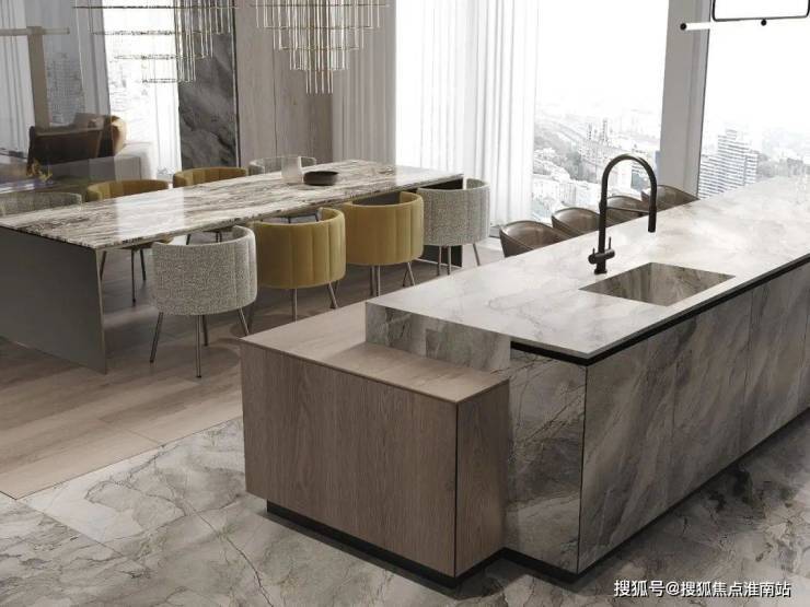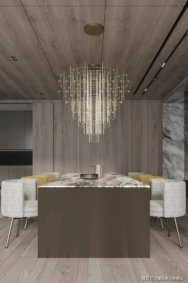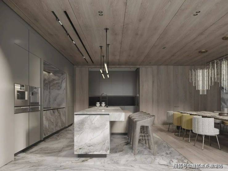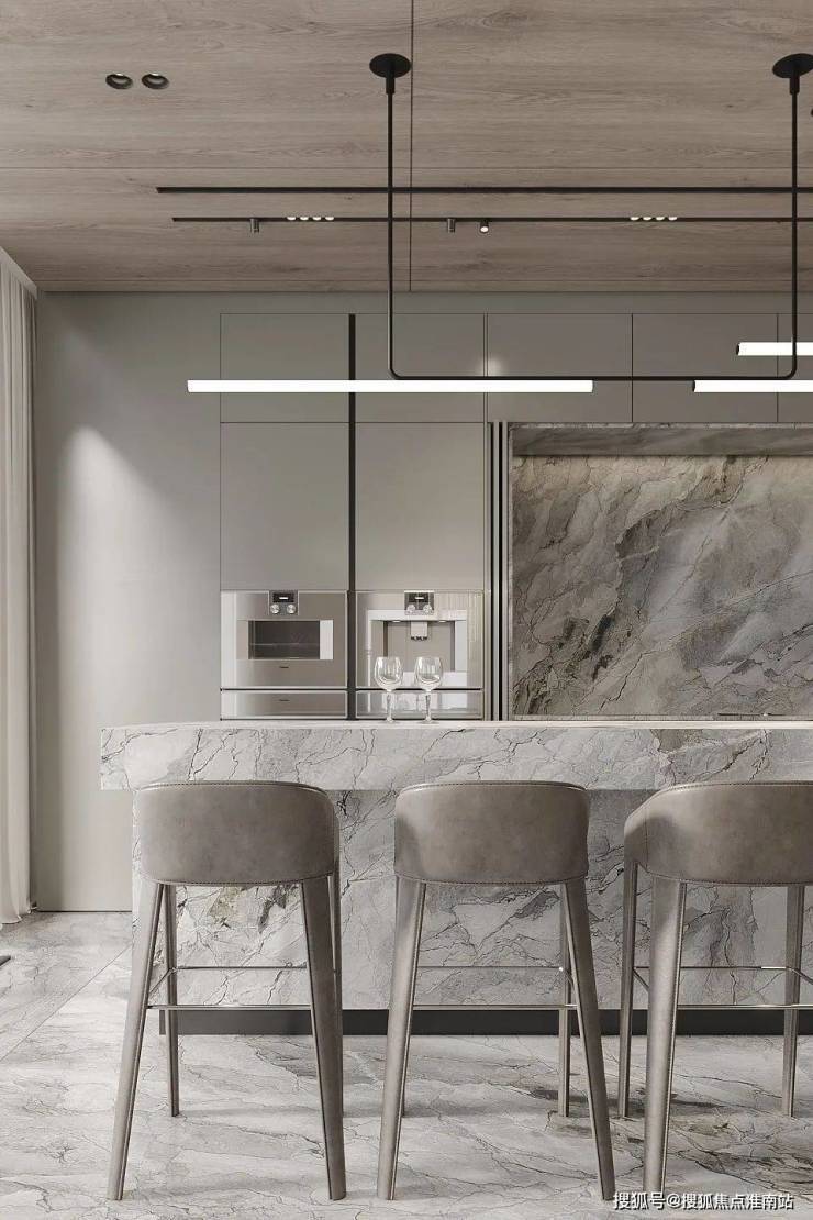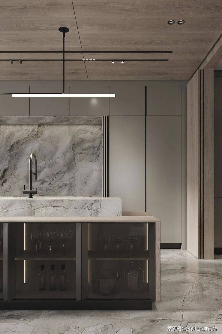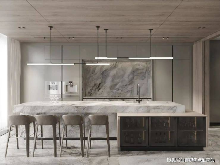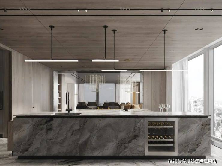 The surface of the island platform is made of marble panels, with delicate patterns that release luxury. The lighting above brings geometric aesthetics, and the lines give a sense of layered beauty. The overall open design makes the space more spacious and sufficient for hosting large private gatherings.