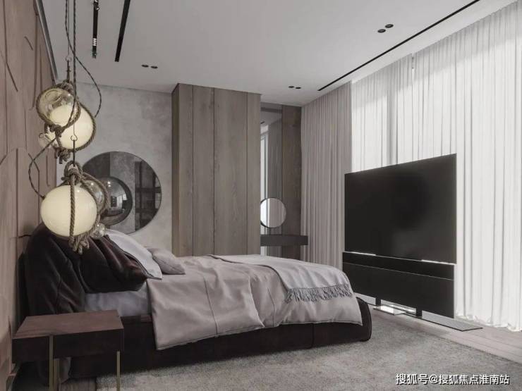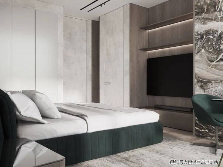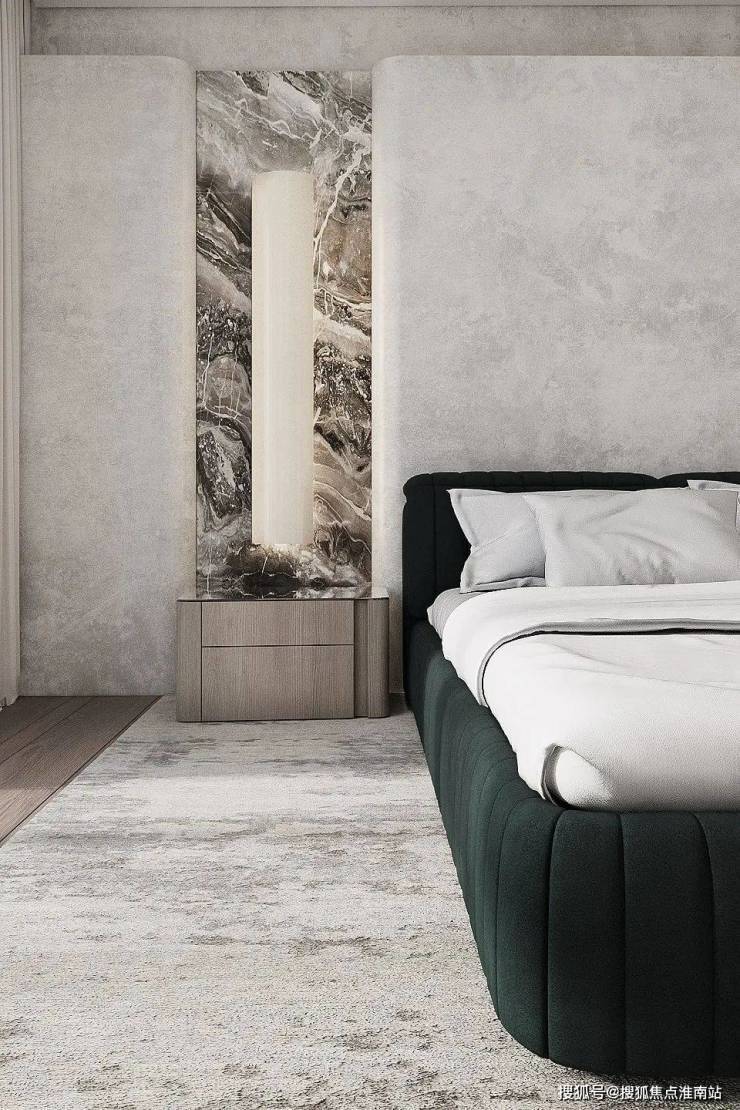 次卧室浅灰色基调中营造细腻肌理,优雅和惬意伴随居者入眠。石材和木质材料结合,书架散发自然气息,大面积落地窗引入优质阳光,空间氛围十分柔和。
