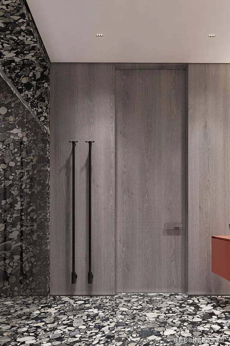 The bathroom is decorated with wooden materials combined with marble, and the wall mounted toilet is very neat. Next to it is a tall storage cabinet.