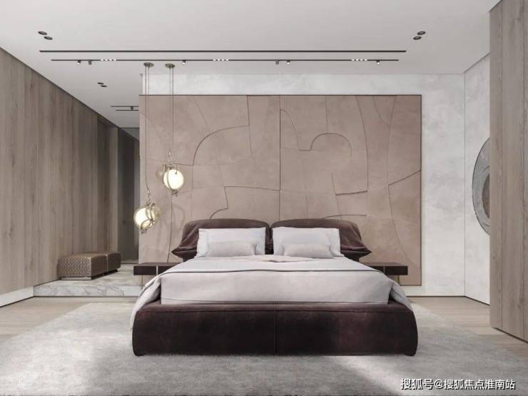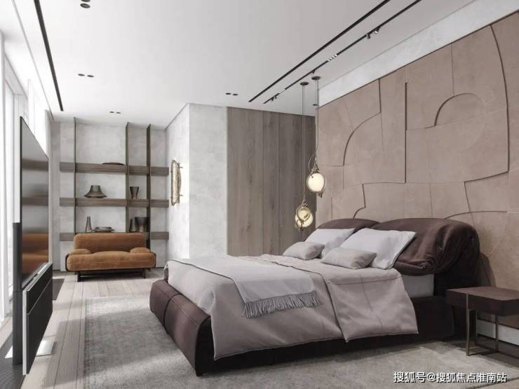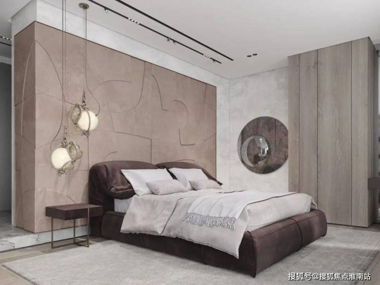 卧室莫兰迪粉背景墙有着凹凸效果,拐角处沙发后侧是收纳柜,摆放一些精美的艺术品,天花板和客厅风格一致。