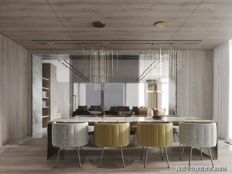 一体化餐客厅中轴生活主场:餐客厅都在同一条中轴线上,连接景观阳台,可以尽情观赏窗外的风景。