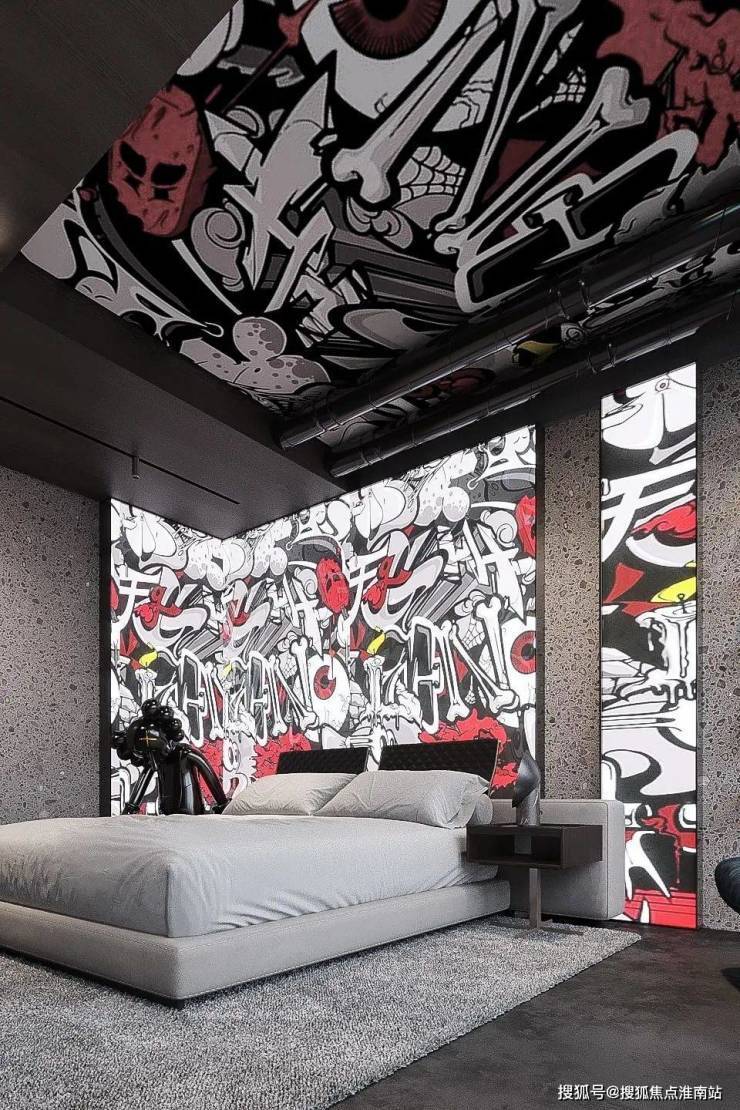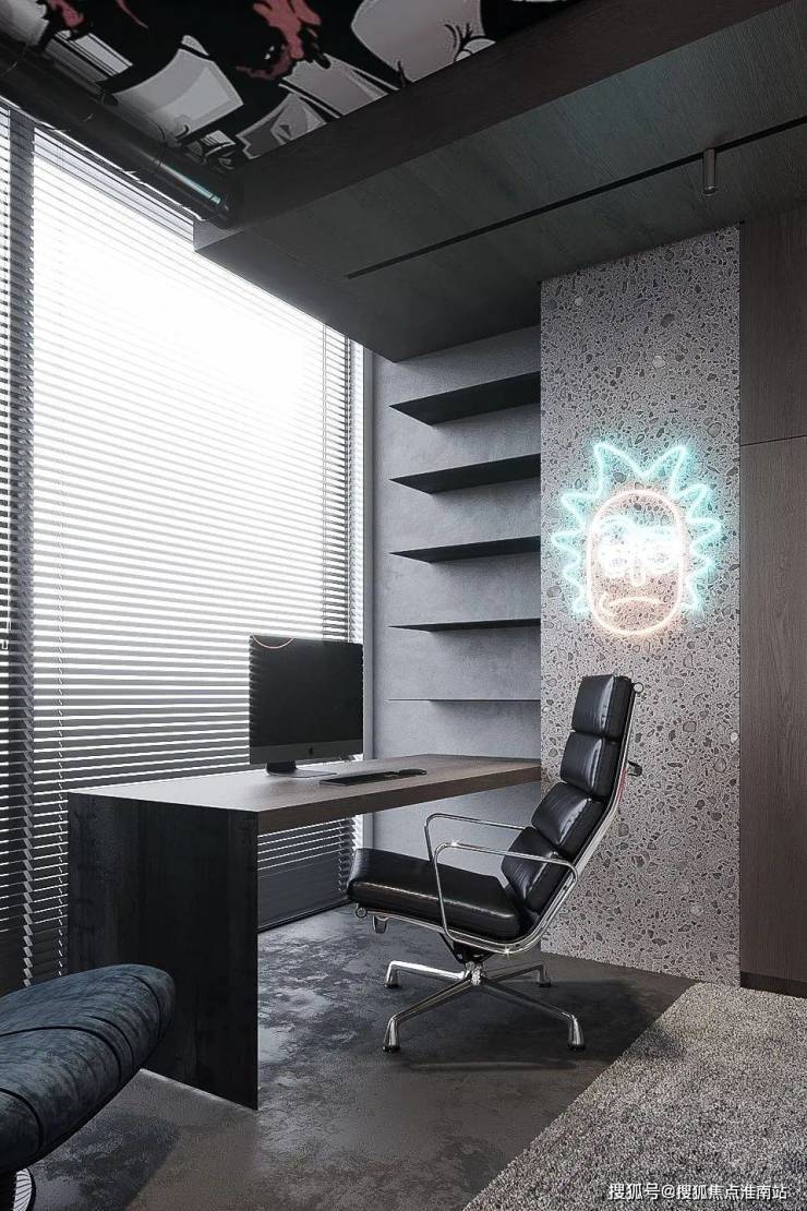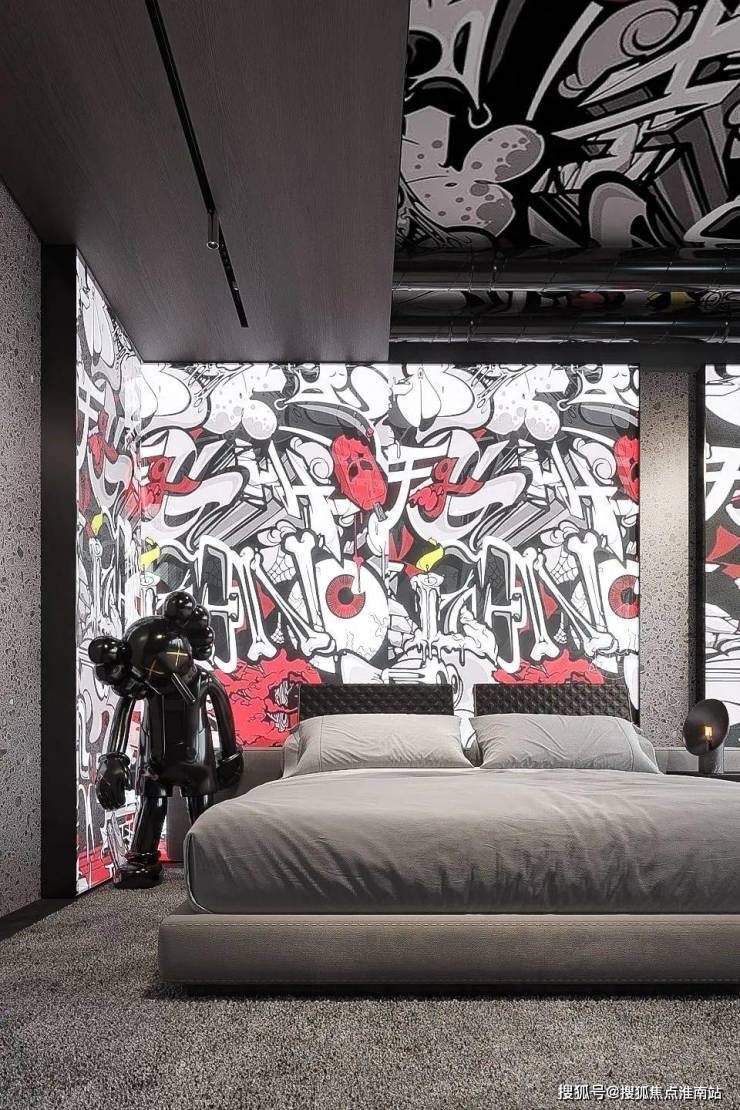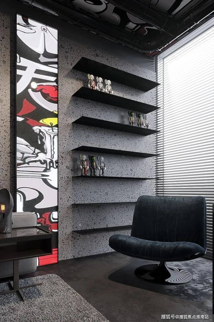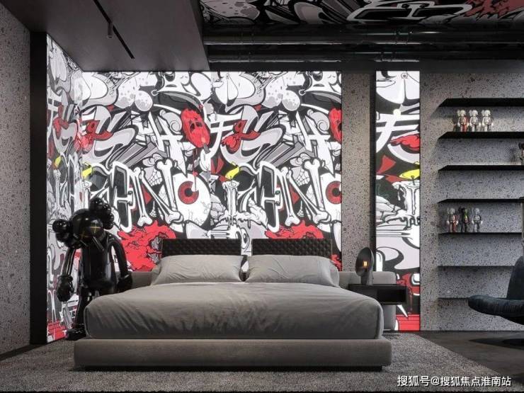 次卧室的卡通画作十分醒目,注入空间活力,内置背景光,让灰色的内敛空间更加明亮温暖。卡片式置物架摆放手办,另一侧是办公区。