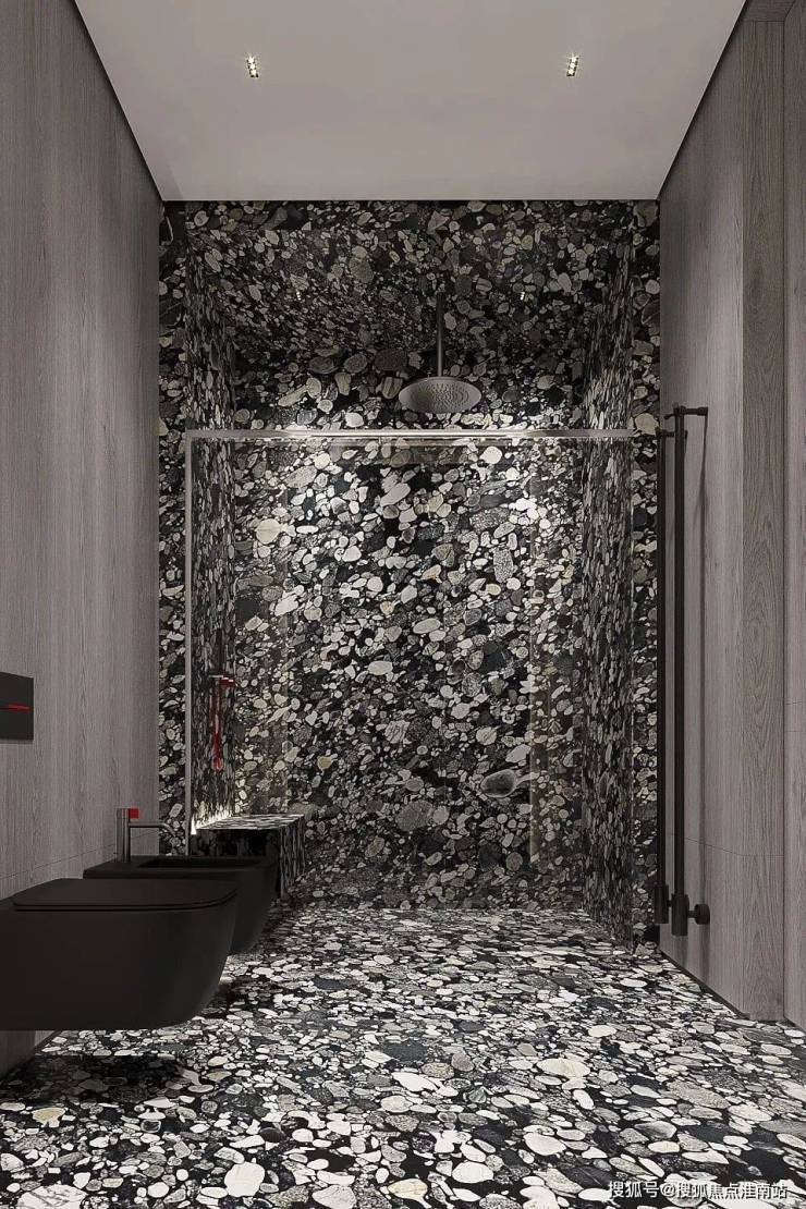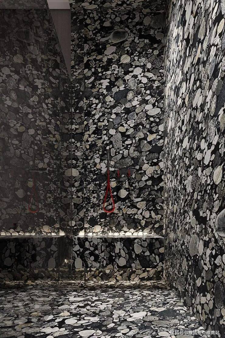 The stone background of the master bathroom brings abstract art, the vermilion washbasin releases warmth and elegance, and the shower area is like a rain flower stone.