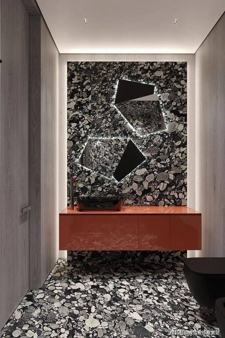 主卫生间石材背景带来抽象艺术,朱红色洗手台释放温馨优雅,淋浴区如同雨花石的意境。