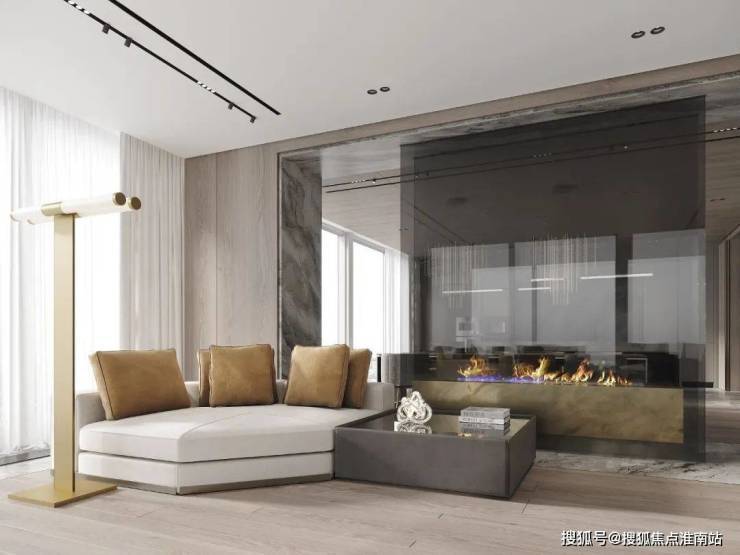 The Morandi pink background wall in the bedroom has a concave convex effect, and at the corner, there is a storage cabinet behind the sofa, displaying some exquisite artworks. The ceiling and living room style are consistent.