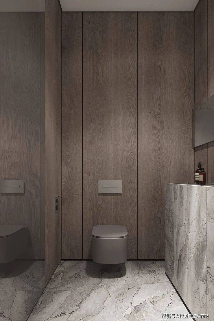 浴室以木质材料结合大理石装饰,壁挂式马桶十分整洁,旁边是高大的储物柜子。