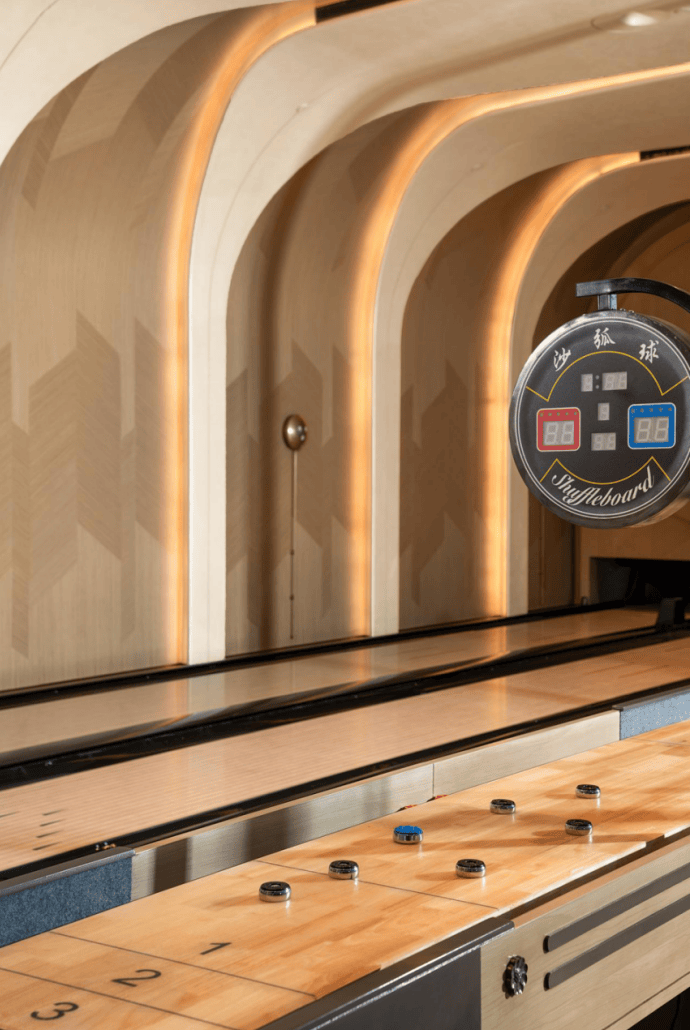 保龄球&沙壶馆:这是在市场很多顶豪都不一定有的首创功能。沙壶是起源于15世纪的英国贵族桌面游戏,如今已是高端派对及圈层聚会的社交催化剂;