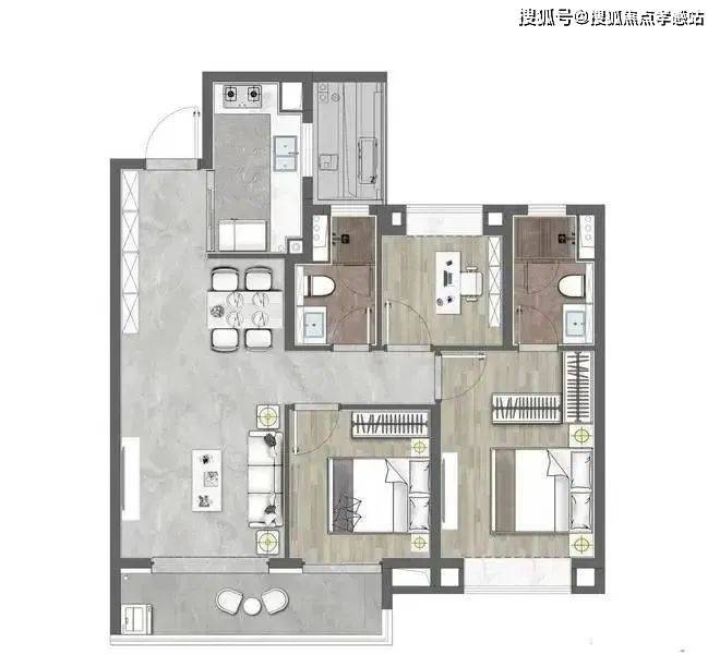 「城投悦江湾」售楼处电话✆:400-8855-420✆该户型做到了三开间朝南+超大面宽横厅+主卧套房设计+卫生间干湿分离+南北通透,功能性和尺度感完美结合。