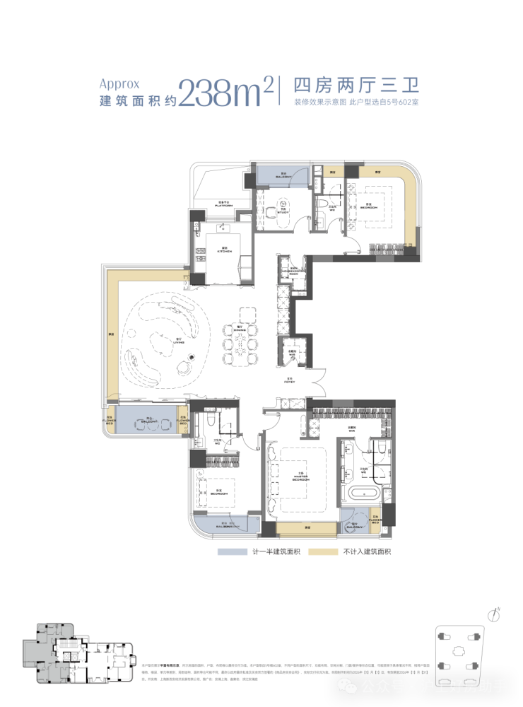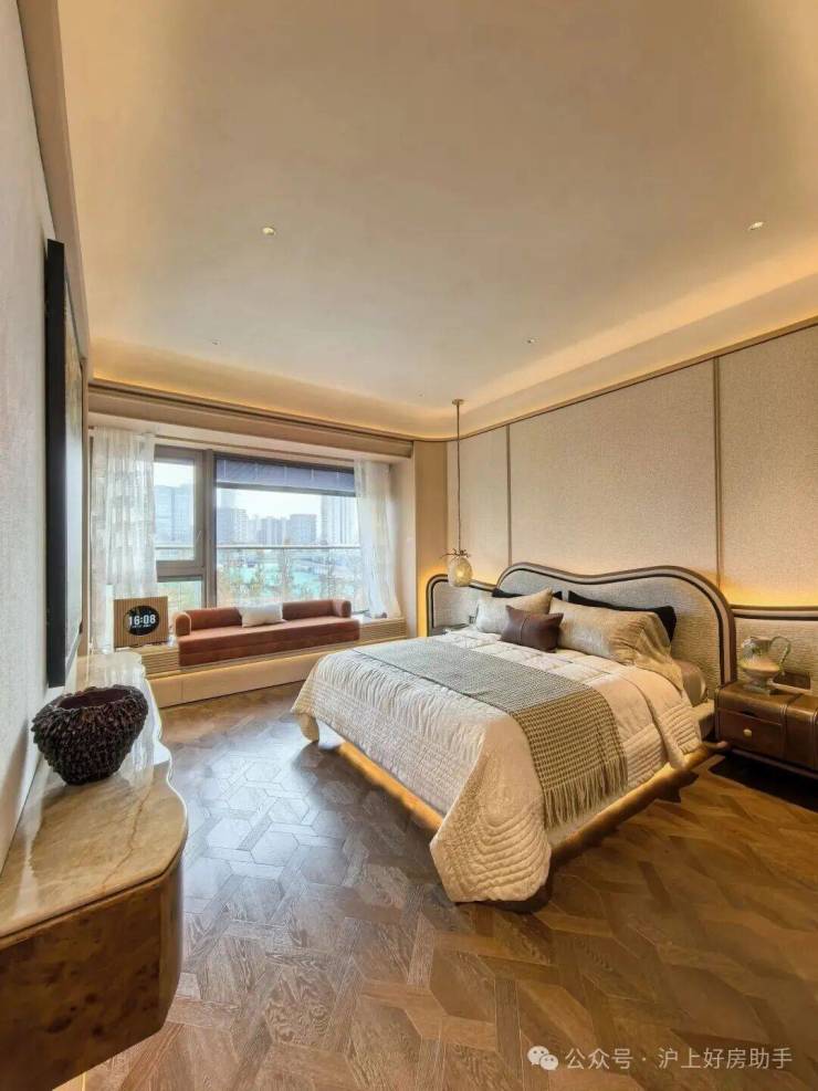 建面约238㎡四房三卫全景舱户型,全屋约46 米全景采光周长,客厅打造连续约 17 米三面采光界面,成就 IMAX 级环幕视野,搭配3.45米奢阔层高,让自然光无死角渗透;朝南双主卧套房搭配全屋六大系统化收纳空间,兼顾家族居住的私密性。