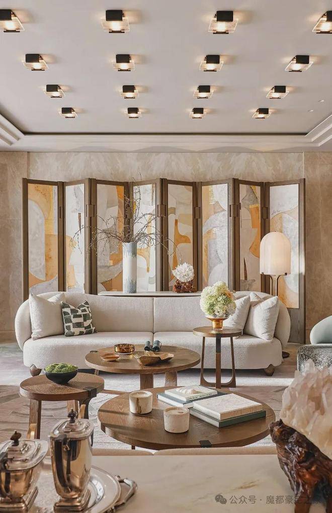 顶层下午茶区以淡绿为底,壁炉暖光漫过手绘地毯的肌理,将社交场域沉淀为冥想容器;主人房墙面缟玛瑙(Onyx)的天然流痕,也与一层屏风暗纹形成时空对位,光影在矿物晶体中生长出私密的诗。