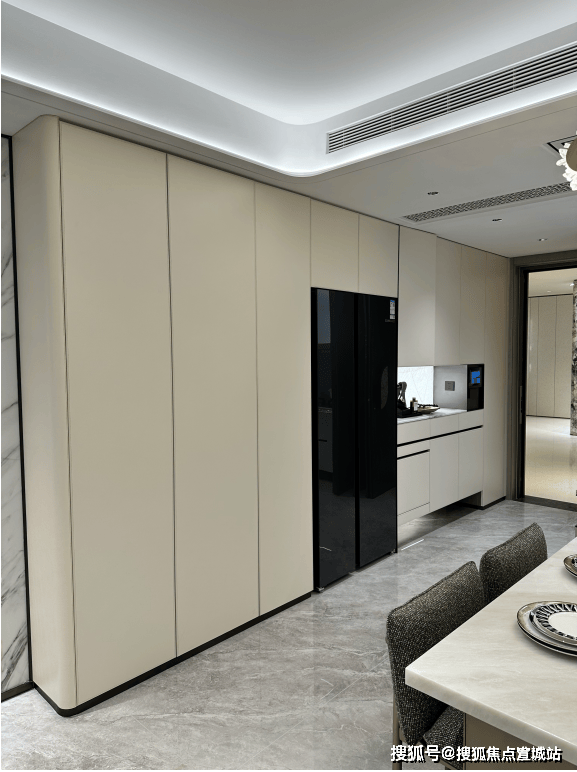 看到约143平户型,厨房岛台和上柜都不稀奇,厨房外的半开放式餐边柜和利勃海尔内嵌式同样也作为交付标准附赠,柜体额外提供接近1立方面积的收纳空间: