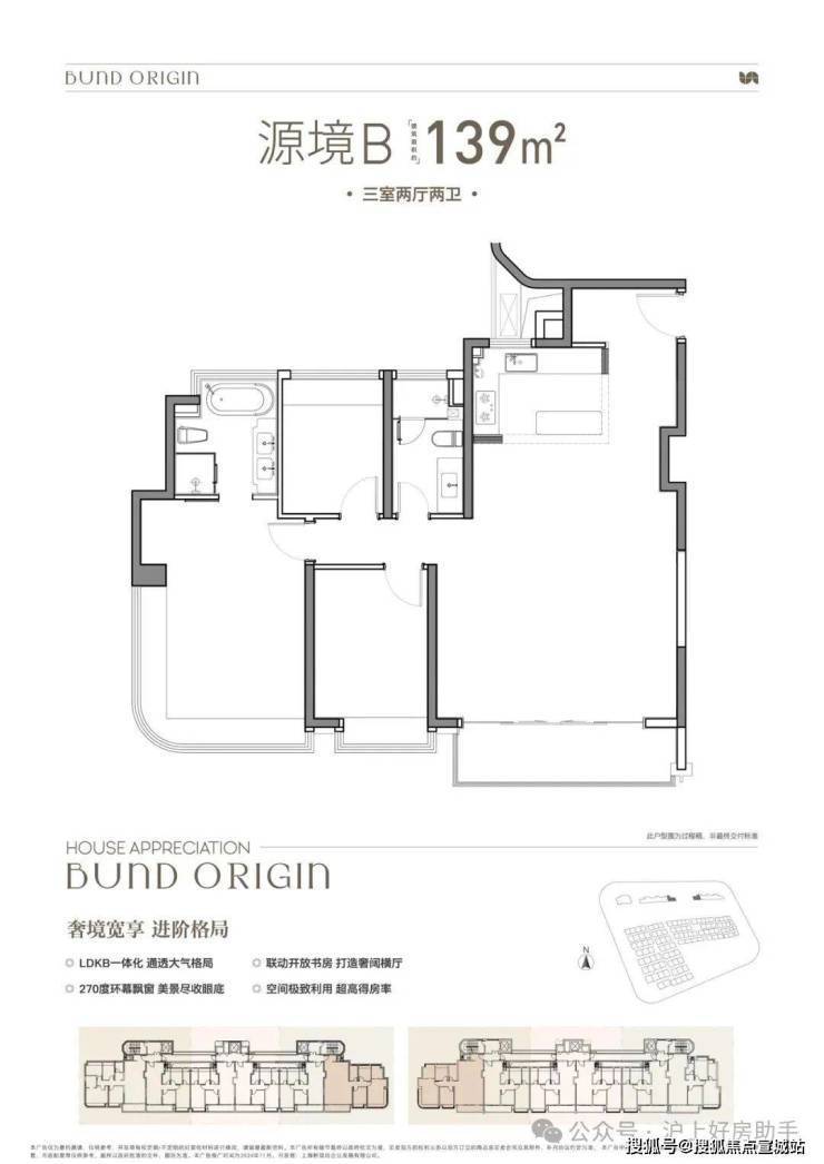 B户型是3房2厅2卫格局,三开间朝南+LDKB一体化+奢阔宽厅+全卧室带飘窗+主卧套房设计+动静分离+主卧270度飘窗,舒适度更高。