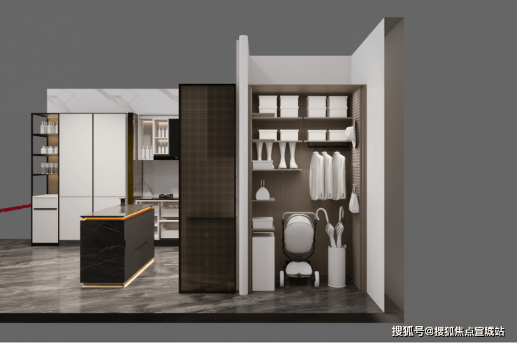 "分户s墙"设计在分户墙处增设“凹型空间",“冰箱外移"增加厨房操作台面和收纳空间,创造更合理的餐厨桌台动线。