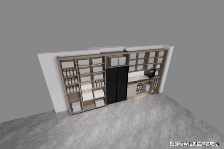 通过示意图我们会看到,一般项目的玄关柜处于成本原因只会做到下图中间位置的冰箱位置就结束,而外滩源著在标配的双开门冰箱(小户型博世或同等品牌、大户型利勃海尔或同等品牌)左侧还额外交付有完整的储物空间: