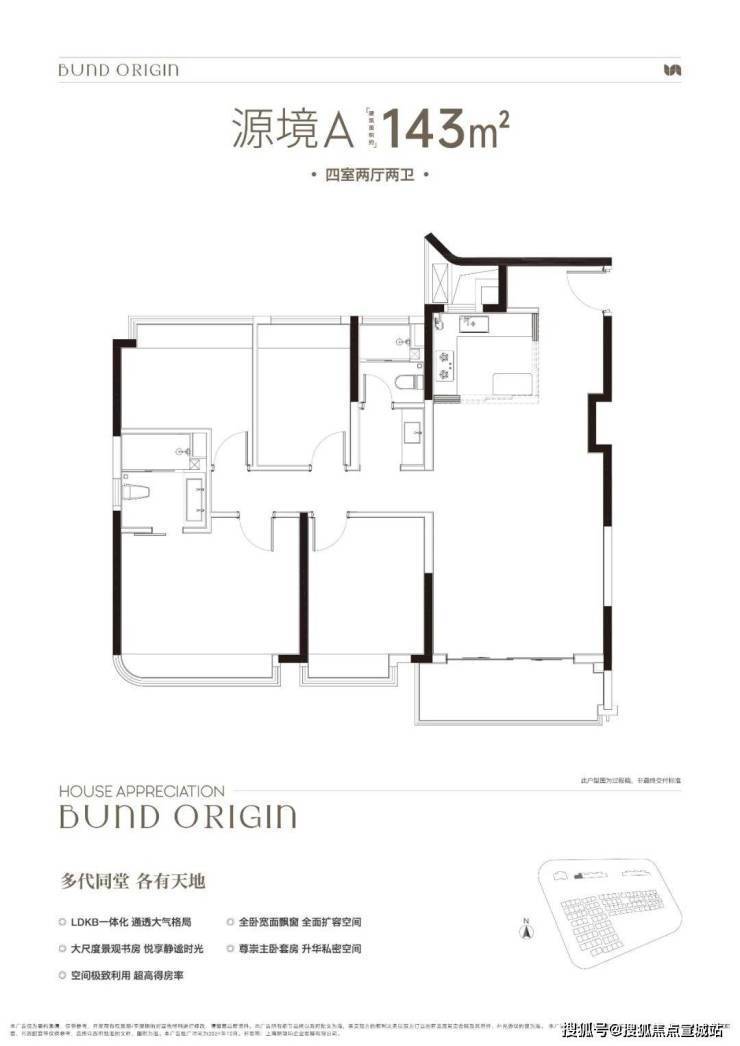 A户型是4房2厅2卫格局,三开间朝南+LDKB一体化+全卧室带飘窗+主卧套房设计+动静分离,居住功能性更强。