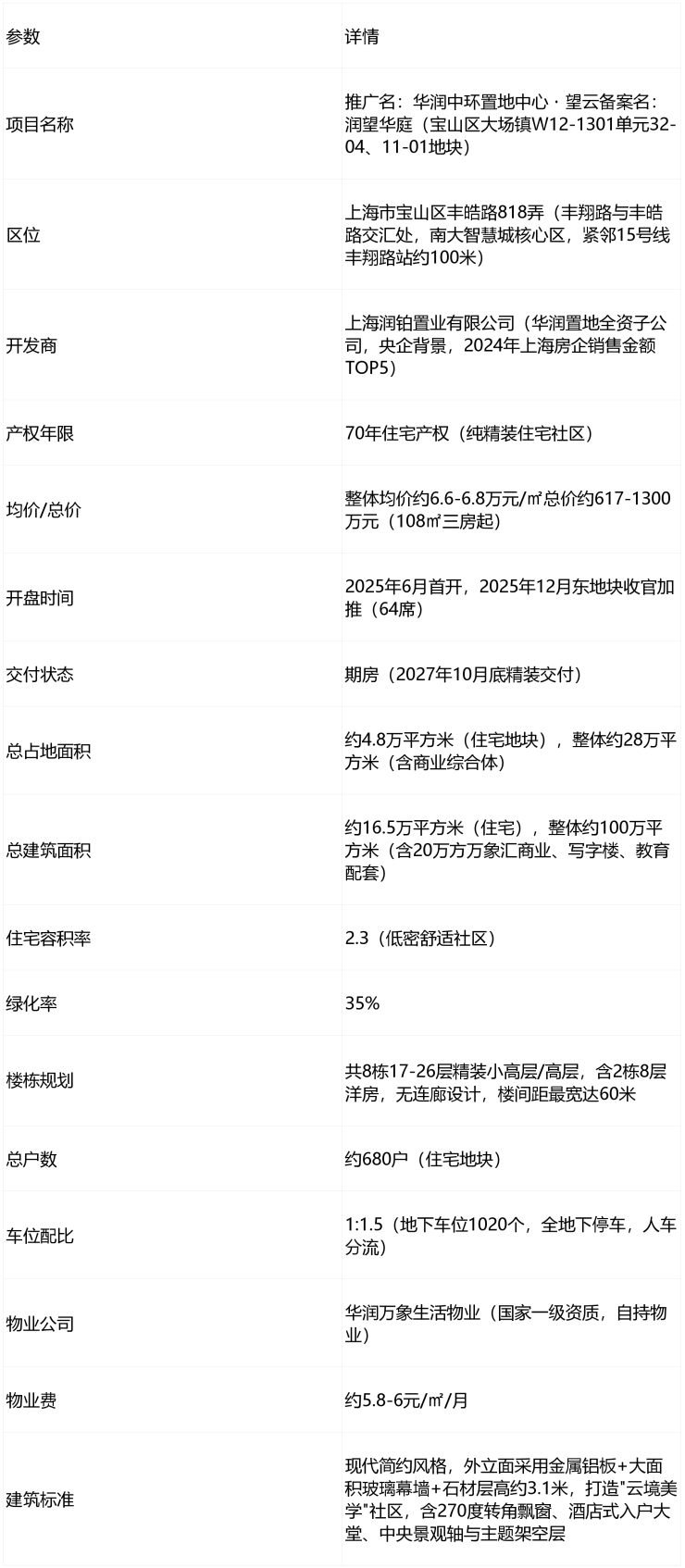 华润中环置地中心望云的核心竞争力在于中环核心区位+百万方超级TOD+15号线地铁上盖+16万方万象汇商业+2.5低容积率+华润精装品质+617万级总价的完美平衡,既拥有不可复制的TOD便捷生活与低密居住体验,又具备价格优势与品牌保障,特别适合追求"便捷通勤+低密舒适+全维配套+央企品质"的改善型客群,是2025年宝山南大板块置业的优质选择。