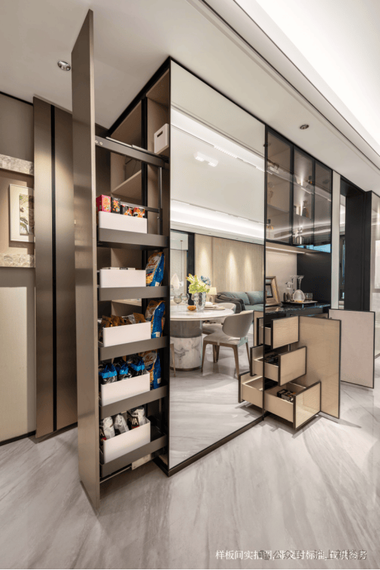 双边收纳矩阵,大件小件皆可存放,满足家庭不同的收纳需求;客厅一侧通顶高柜设计,高尔夫球杆、羽毛球球拍、鱼竿等多尺寸大件轻松容纳,累计可收纳200双鞋子;餐厅一侧的多功能餐边柜,集吧台、展示柜、收纳柜三合一功能为一体,同时,侧面也配备侧拉零食柜、储物柜,进一步提升家庭精细化收纳,饮料、酒水、零食、行李箱等可轻松规整,精细化分区,让家井井有条。