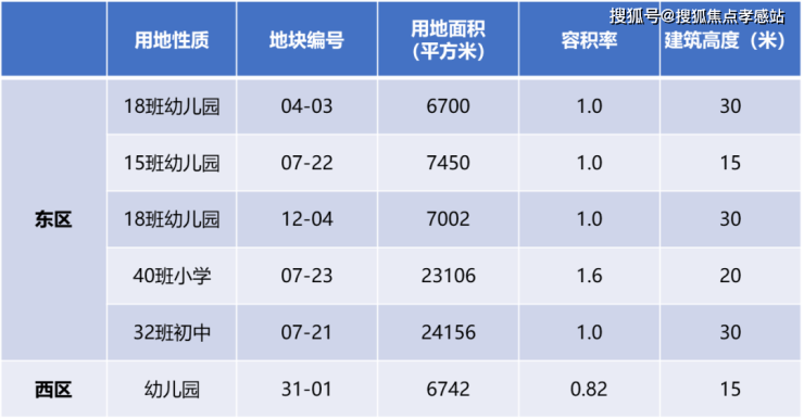 东区和西区最大的不同在于教育和公建设施配套,东区人口更密集,有5幅教育用地,从幼儿园至初中;而西区仅有1幅教育用地,作为幼儿园。