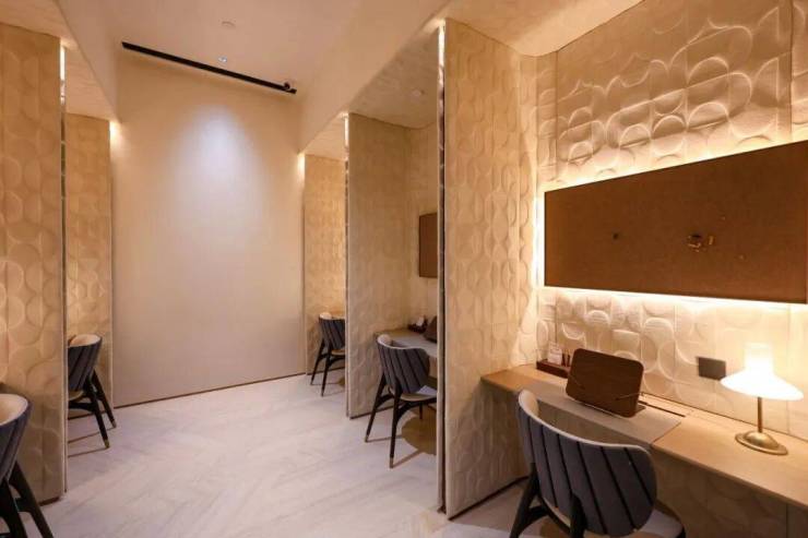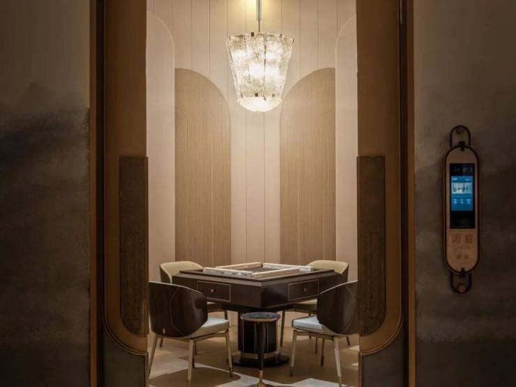 私宴厅&棋牌室承载了业主宴请、聚餐、洽谈、品茗、娱乐等多元社交场景。私宴厅当中悬挂的石材,来自项目团队多番挑选,来自一个奢石展馆里的孤品,不仅拥有昂贵的蓝色色泽,天生的羽毛状纹理更是罕见!