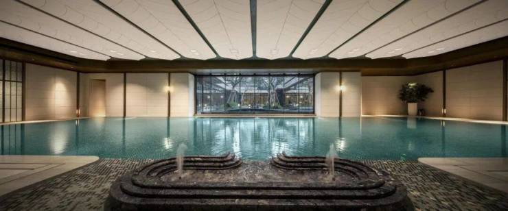 恒温泳池:第一,采用了景德镇烧制的陶瓷马赛克,独特的釉面色彩由景德镇老师傅手工浇筑而成,充满人文艺术底蕴;第二,羽毛天花造型,由600余件铝板打造,表面采用了仿贝壳纹的艺术漆处理,带来松弛度假感;第三,不仅配置了约25m×10m的4道泳池,还采用了奥运会同款空调除湿系统,彰显高档品质细节!