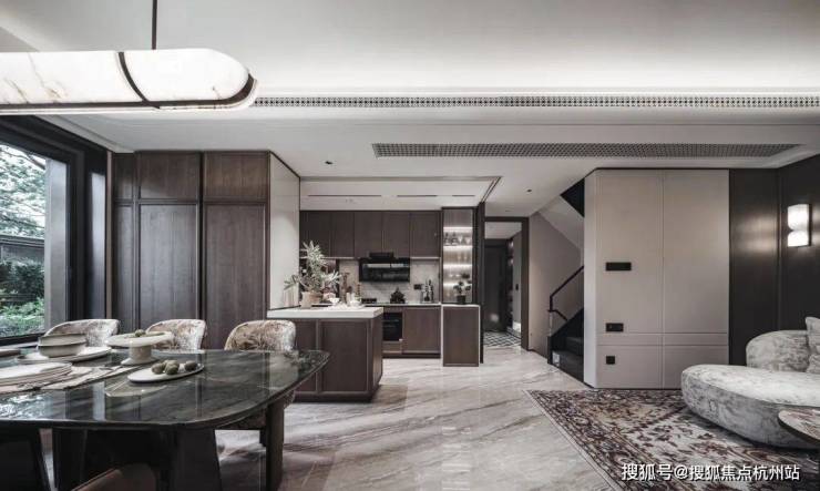 首先是奢石含量极高,从入户处的玲珑玉拼花与透光云石辉映,到翡翠绿奢石墙景、再到发光云石装饰点亮归家路,石材的典雅贯穿始终。