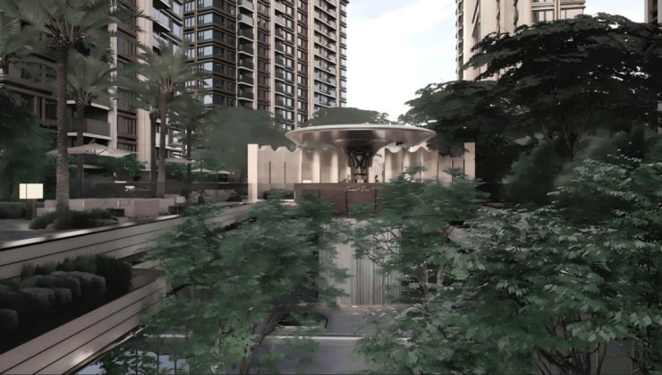 150M社区入口超宽界面结合大水景、天然石材和罗汉松,打造礼仪式归家落客界面,也将度假感受完整引入业主的日常生活,实现 “出则繁华,入则度假” 的生活场景。在用地边界上,进行红线内外一体化开发打造,利用外部1.7万方绿地,小区内部景观与外部绿地一体化开发,模糊城市与社区之间界限,消融社区封闭和冰冷感:在红线外,打开城市松弛感,将全球风景纳入日常重构松弛生活的新生态;红线内,甄选了全球代表性的五大花园进行场景落位,让每一次游园成为穿越世界的旅行。