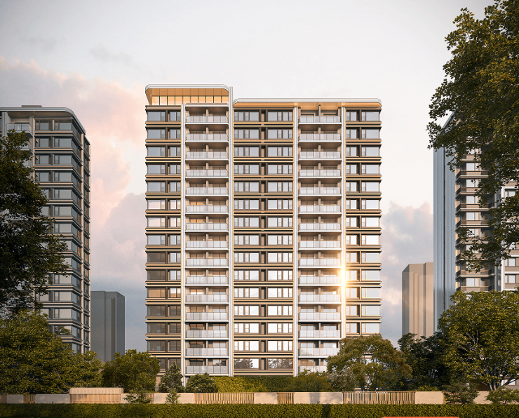 社区大门的优美的建筑弧度,来源于希腊One&Only 的唯逸度假酒店,让建筑犹如灵动飘逸的缪斯裙摆;在材料色调上,集萃上海文脉的“摩登金”,映射了十里洋场的复古韵味,与贝金米黄、香槟玉石等天然奢石 交相辉映,形成温润而精致的美学触感。建筑立面在温润放松与精致摩登之间取得完美平衡,以微弧元素为母题,致敬上海artdeco摩登气质,采用米白色与金色等温暖色彩的材料与去棱角化的造型设计创造温润如玉的立面印象。