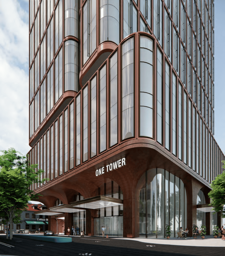 分建筑以暖色为基调,香槟金为点缀,采用大面积玻璃幕墙+铝板弧形立面;