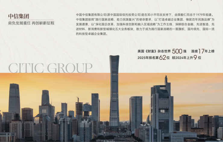中信集团位列美国《财富》杂志世界500强排名中连续17年上榜,2025年排名全球第62位。