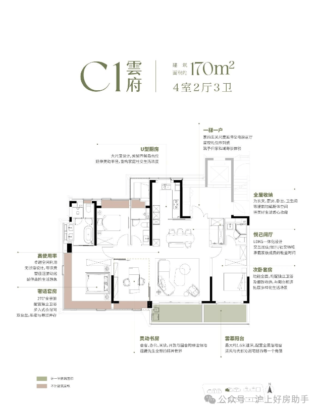建面170㎡“悬浮全景舱”户型:——南向 15.8 米四面宽让每个空间都享阳光平权,深 U 型厨房预留西厨岛台,约8.35 米双阳台兼顾功能与情绪价值,双套房 + 270° 全景窗 + 三卫设计,更将 “新平权主义” 落到实处,让每位家庭成员都有私密空间;