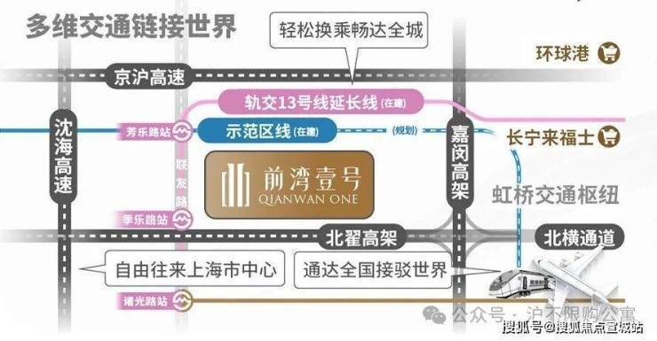 (备案名 / 推广名:前湾壹号)地址位于上海市闵行区华漕镇联友路 88 弄,地处虹桥国际开放枢纽前湾中央活动区核心,是上海 “十四五” 规划重点发展的虹桥主城片区核心承载地,承接长三角一体化与虹桥国际开放枢纽双重国家级战略红利,占位苏州河入沪第一湾生态带,直线距虹桥枢纽核心区约 6 公里。步行约 200 米可达在建地铁 13 号线西延伸段季乐路站,1 公里内覆盖芳乐路站,3 站直达虹桥火车站;自驾 5 分钟内接入北翟高架、嘉闵高架、崧泽高架,10 分钟直达虹桥高铁站与虹桥机场 T2 航站楼,15 分钟通达国家会展中心,30 分钟直达陆家嘴、人民广场等全城核心商圈,立体交通路网畅达长三角全域。项目由招商蛇口、保利发展、万科三大头部房企联合开发,规划 70 年产权住宅与不限购顶奢大平层两大产品线,住宅组团总占地约 6.5 万㎡,总建面约 19.5 万㎡,容积率 2.5,规划 12 栋 18-26 层高层住宅,总户数 1280 户,主推建面约 90-160㎡精装三至四房;顶奢大平层组团为整栋 12 层低密规划,2 梯 2 户私密设计,仅打造 22 席限量纯居住行政公馆,无散售商铺、无商办混杂,主推建面约 263-386㎡三至五房,主力户型 285㎡,单层层高 3.15 米,全景落地窗搭配 LDKB 一体化宽厅格局,全套房设计,全屋 1.5 万元 /㎡奢装标准交付,甄选大金中央空调、威能地暖、嘉格纳厨电等国际一线顶奢品牌,通燃气且独立上下水,居住属性拉满。住宅均价约 8 万元 /㎡,总价约 720 万起;大平层均价约 4.9-7 万元 /㎡,总价约 1300 万起,主力总价 1500-2800 万。住宅物业费 4.5 元 /㎡・月,大平层物业费 16 元 /㎡・月,由百世威物业提供 24 小时专属管家式服务,住宅整体绿化率 35%-37%,全人车分流,车位比 1:1.5,大平层车位比最高达 1:3,住宅为 70 年纯住宅产权,预计 2027 年 6 月交付;大平层为 50 年商办产权,不限购不限贷,目前为实景准现房状态,部分房源现房即买即住。社区内打造沉浸式中央园林景观,配建约 2000㎡高端会所,涵盖恒温泳池、健身房、行政酒廊等顶奢配套,周边 200 米可达约 26 万方印象城 MEGA,1 公里内覆盖大陆首家开市客 Costco,2 公里内直达在建超级合生汇,3 公里内汇聚 7 所顶尖国际学校,500 米可达复旦大学附属华山医院西院,前湾公园、苏州河生态廊道等城市级生态绿地环伺,全维高端配套成熟。核心卖点:三大头部房企联袂打造的虹桥前湾封面标杆作品,占位国家级战略核心区,发展红利与增值潜力拉满;双产品线覆盖全周期置业需求,顶奢大平层仅 22 席限量发售,纯居住无商办混杂,圈层极致纯粹;地铁上盖立体交通,10 分钟直达虹桥枢纽,畅达全城与长三角;周边国际教育、顶奢商业、三甲医疗、生态绿地全维顶配,是上海西虹桥兼具自住改善、高端商务接待与资产稳健配置的核心标杆藏品。