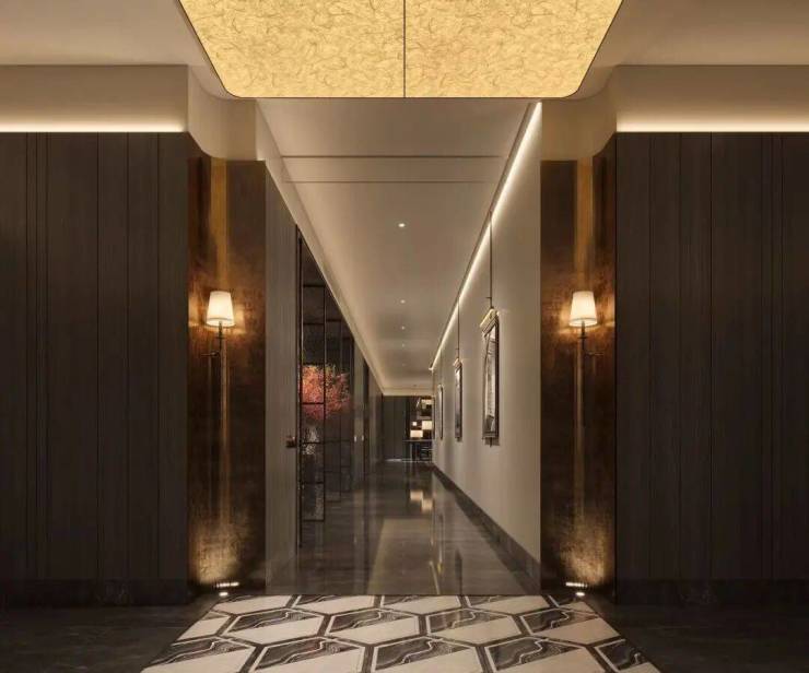 电梯厅融合梵高印象岩板与超白洞石大面积的铺装,彰显出了细腻雅致!