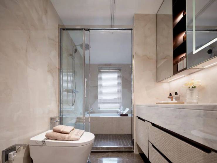卫浴系统甄选伦敦宝格丽酒店同款汉斯格雅五金,配备全球五星级酒店及总统府标配的杜拉维特卫浴套装与恩仕AXENT智能马桶。