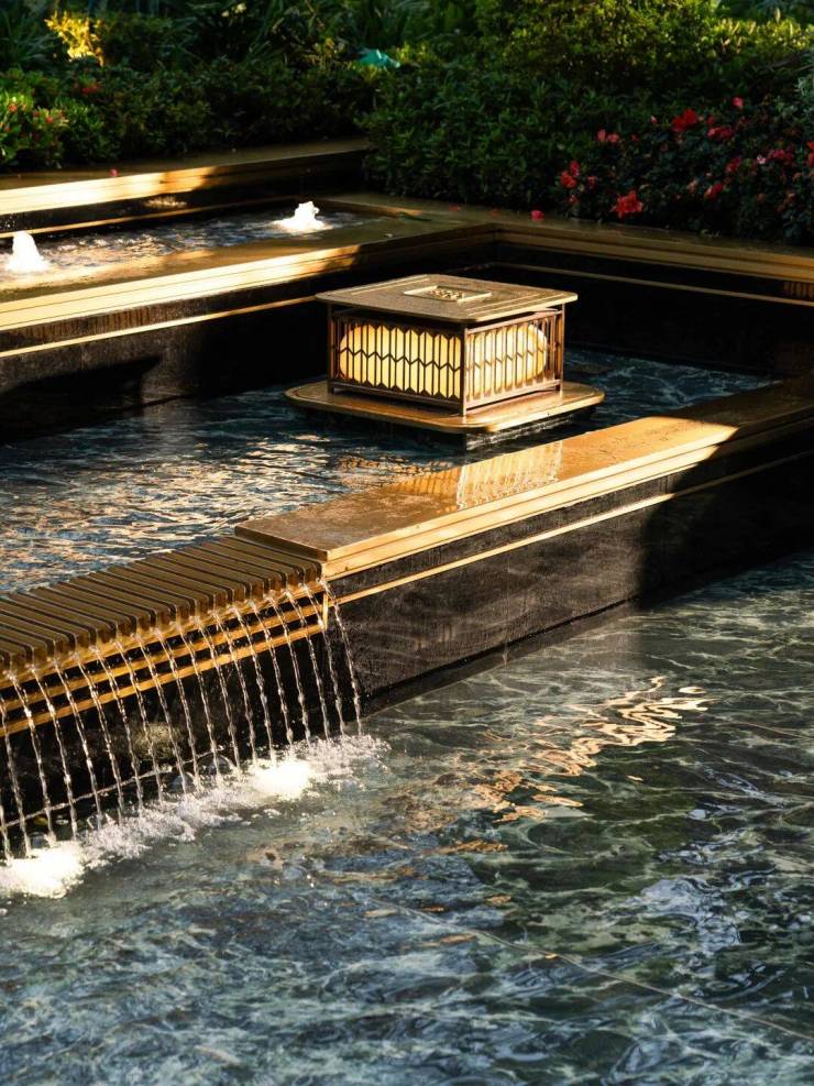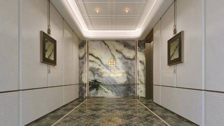 大堂地面也采用金世纪水刀拼花工艺与香格里拉黑大理石,辅以莫奈花园奢石背景墙,营造了非凡的气度。