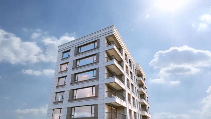 其一,项目外立面以新古典建筑风格为魂,甄选巴西进口白世贸石材,并且干挂到顶!